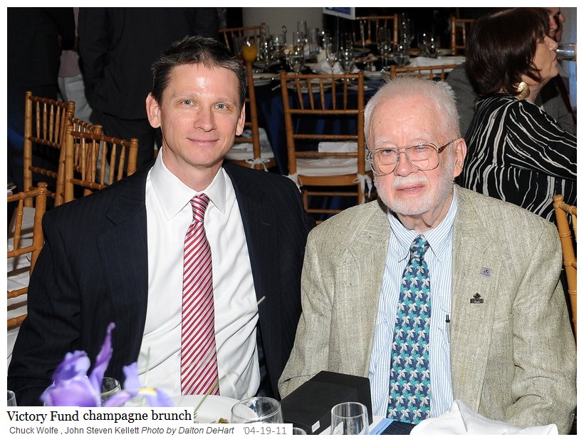 away from the limelight, choosing to work behind the scenes, First from a 2011 Victory Fund banquet, with President Chuck Wolfe