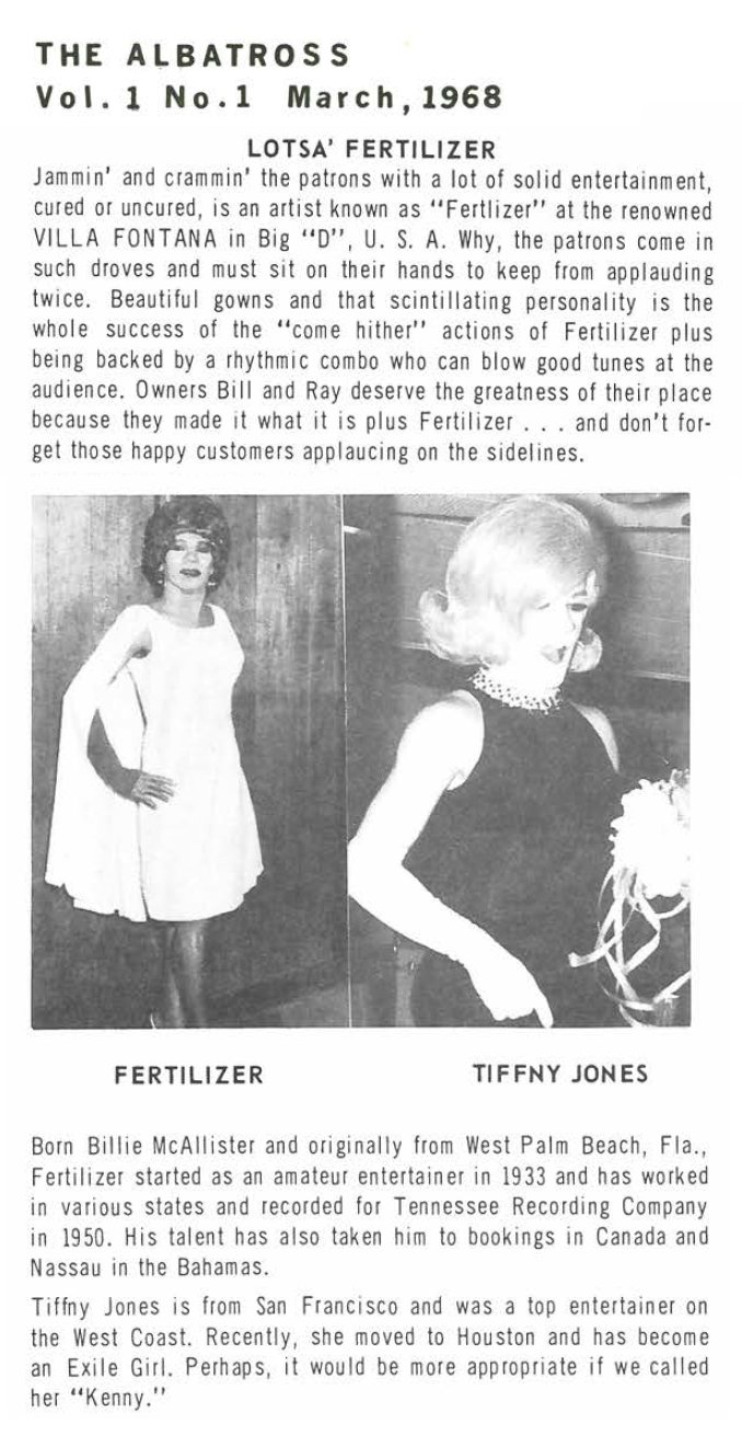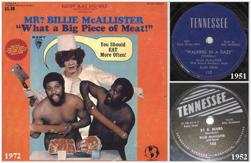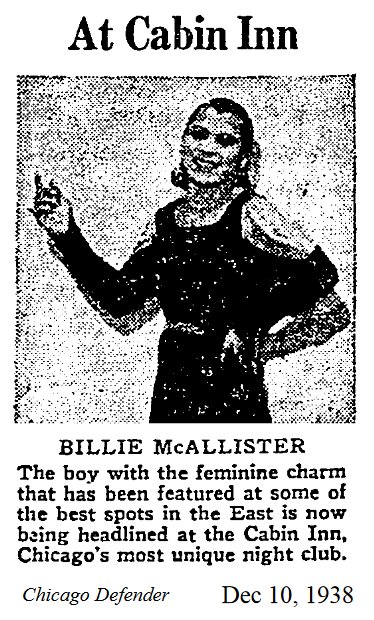 Billie McAllister started doing drag as early as 1938, and recorded some blues 78s in the early 1950s. By the 60s he was performing often in Houston and elsewhere, and then in the 70s did a couple comedy LPs.