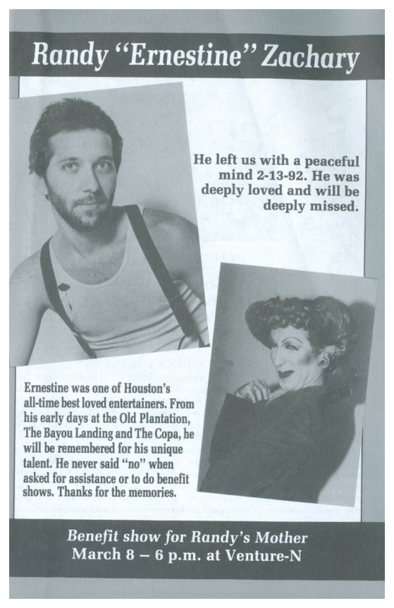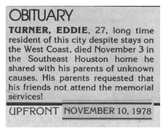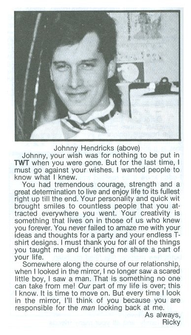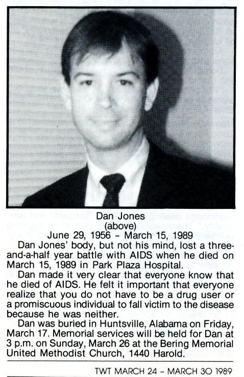 & Observations About the Data Time Span The main time span chosen focuses especially on 1982 through 2000, which reflects the main AIDS crisis years, and it is planned to expand the years covered in the future. While the majority of individuals in the data base have died of AIDS, we do not intend to infer that to be the case if it is not mentioned in a specific listing, nor is the sexual orientation implied to be GLBT. For many of the listings, the tag word "AIDS" has been added, so that the internal search engine can find it, but again, only for those listings that state the individual died of AIDS, or imply that by requesting donations be made to an AIDS organization. I am viewing this project as a number of phases, and phase 1 is all the data I can retrieve from This Week in Texas magazine (TWT) for 1982 through 2000. Next I will work toward expanding the years before and after this span, and already have a number of obituaries for early years. And, again, while I am not terming this as an "AIDS" database, realistically the bulk of it is. TWT stopped its initial run in August of 2000, and when it re-started in June of 2006 it featured almost no obituaries, either by policy or perhaps few were submitted. In later phases it is intended to add obituaries from other publications (Montrose Voice, New Voice, Texas Triangle, etc) when access is available. Comments about TWT including obituaries The magazine began in April 1975 and the first AIDS death in Texas was in March of 1982, with a total of ten by the end of the year. The numbers grew rapidly and in June of 1983 TWT began showing the obits in the back of the magazine. Prior to that, they were "news stories." In the early years almost all death mentions in TWT were the result of crimes, and for many of the victims there were not obituaries at all, just the news report of the event and sometimes the apprehension of the murderer by police.