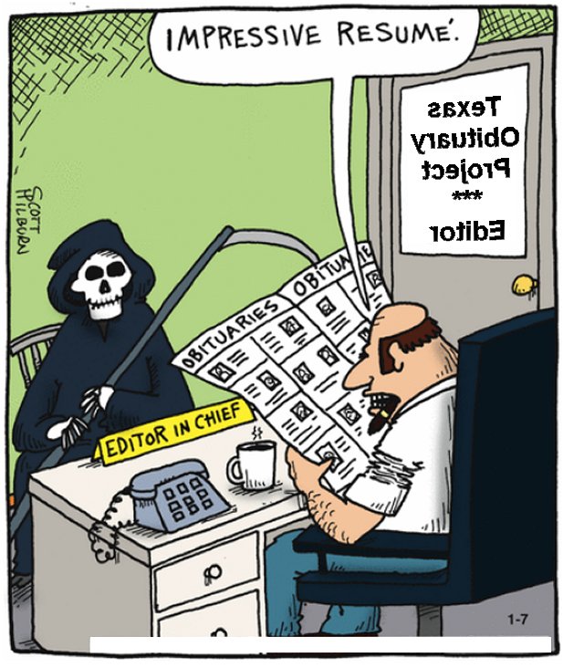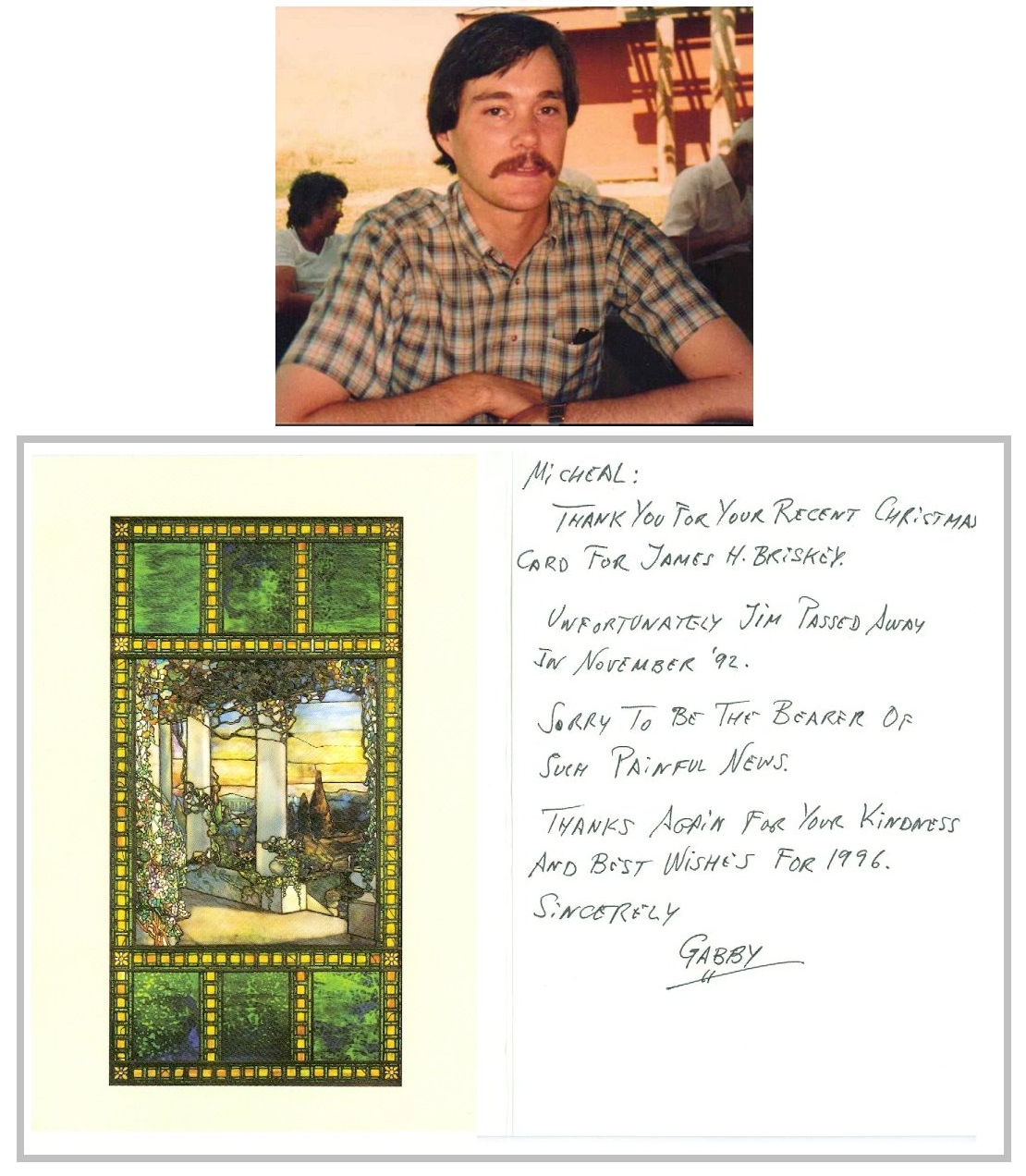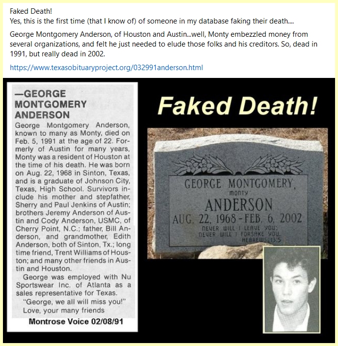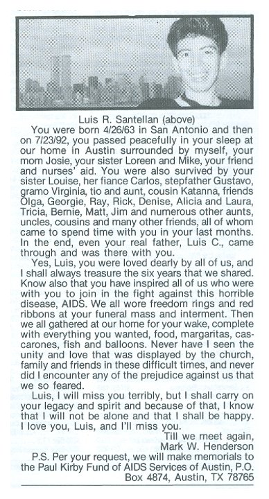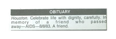 How We Got the News..... My Texas Obituary Project got a Bunch of publicity in the front page Chronicle article on April 28th, 2018, and one thing that happened was that someone who read it contacted me. She had bought a copy of the book The Quilt, about the Names Project, in an estate sale, and in it the owner had stored obituaries he had saved, maybe 75 or so of them. And she offered to send them to me...of course I accepted. One of them reminded me of some of the poignant ways we "got the news." The owner, Michael, had sent a xmas card to James Briskey, only to be told James had died, ....three years earlier. While my Texas Obituary Project has a loose ground rule of it being only for folks who had lived in the state, I thought he deserved some effort and put a page for him together at the link. He was 38 and lived in Seattle. http://www.texasobituaryproject.org/112292briskey.html And, This