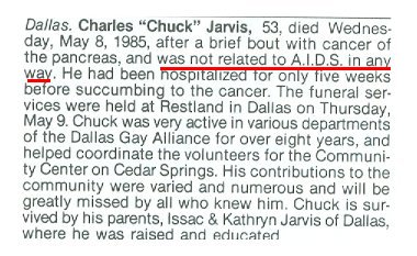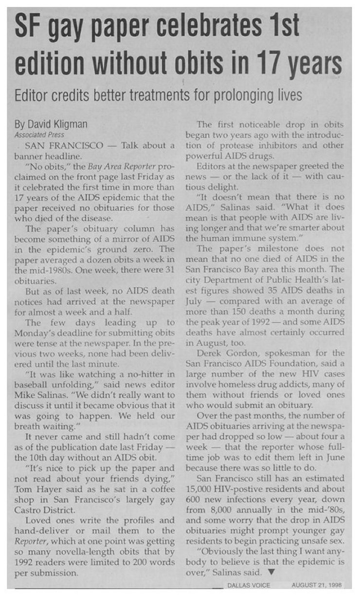displaying this fear even though in this case it was not an AIDS death. I have nothing but a gut feeling to back this up, but I would speculate that the AIDS totals, if truth be known, would be double what the data actually indicates. How can you help? The data you find at any time is all the data I have, so if an obituary for your friend/lover/etc is not in the data base, it could be there was not one submitted. If you can send me a scan of one (from any source, any year) I would be glad add it. Remember, these are mainly just the obits given to TWT, and a few other publications. Many obits were simply not submitted, for a variety of reasons. For example, especially in the early years there was a stigma about dying of AIDS, or even in some families about being gay, or perhaps some did not know the gay publications existed. Data BY gay people The data in these publications were unique in our history for an interesting reason. This is likely the first time that obituaries were placed not by the person's family but by their friends and lovers. This would be a quick explanation for the presence of so many drag performers dressed in drag in the obit photo. Few families would even consider that option, while a person's gay family would know the person's preferences. Search Tips & Tags The internal search engine is precise, so if you are searching for "Ken West" you will get different results than for "Kenneth West," so also try variations of someone's name. You can also search for data on a more global basis, such as entering "AIDS" and "Dallas" will yield the number of obits from AIDS in that city. Again, I only inserted into the text the word "AIDS" if mentioned in the obit or if it suggested donations to an AIDS charity or hospice. I realize that many more died of that cause without it being mentioned, perhaps by my estimate 50% more of the overall data. There are some "category" tags hopefully useful to researchers, like "Black," "Latino," "female," "violence," "drag," "COVID," etc. A comment about that data: to face reality TWT was a gay male publication, and mostly a gay white male one. To search on "Black" and get such a tiny number of matches is not credible. Of course Black people got AIDS. An explanation is that perhaps that community did not feel a connection to the publication, or culturally there were greater stigmas to "admit" dying of AIDS or even being gay (and of course straight people had the virus). (Naturally, I could only add a "Black" tag if there was a photo to go by. Photos are present in roughly three fourths of the obituaries). Data for Hispanic people are much more present, though also not in the proportion you would think reasonable. Women? Again, there is only a tiny number. From this database one might think every lesbian is still alive. When the obituary provided the information (and few did) I have tried to enter the full name of a person's partner, whether pre-deceasing or surviving. So, if you know the name of someone and cannot think of the late partner's name, try searching for the other name. Of course if the obit just said something like "survived by Randy," that data would not be meaningful and was not entered. Also, when data relevant to a person's social or business life was provided I would often enter it. Such as, if they were manager of a particular gay bar, or a member of a gay chorus or social or sports group, those words can be searched. A side comment, I have a listing from 1999 of deceased members of the Gay Men's Chorus of Houston (from a performance program) and less than half have obituaries that I found. So, there's a lot of missing data. Data By Year Searching by year and then adding the word "AIDS" tells relative impact of the crisis, with the first number being the total per year, the second being the AIDS total. Note that data from 2000 stops in August, when TWT did. Data per 07/29/21 figures, and again are just Texas figures, from my site. From being around this data for years, if