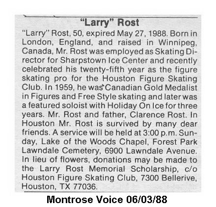 Information acquired by Brandon Wolf: Larry Rost was a competitive Canadian figure skater who landed in Houston. He taught figure skating at the Winterland Ice Arena (2400 Norfolk) in the 60s and 70s. Winterland was located a block north of the Southwest Freeway and a block east of Kirby, behind about an eight story office building that still stands.